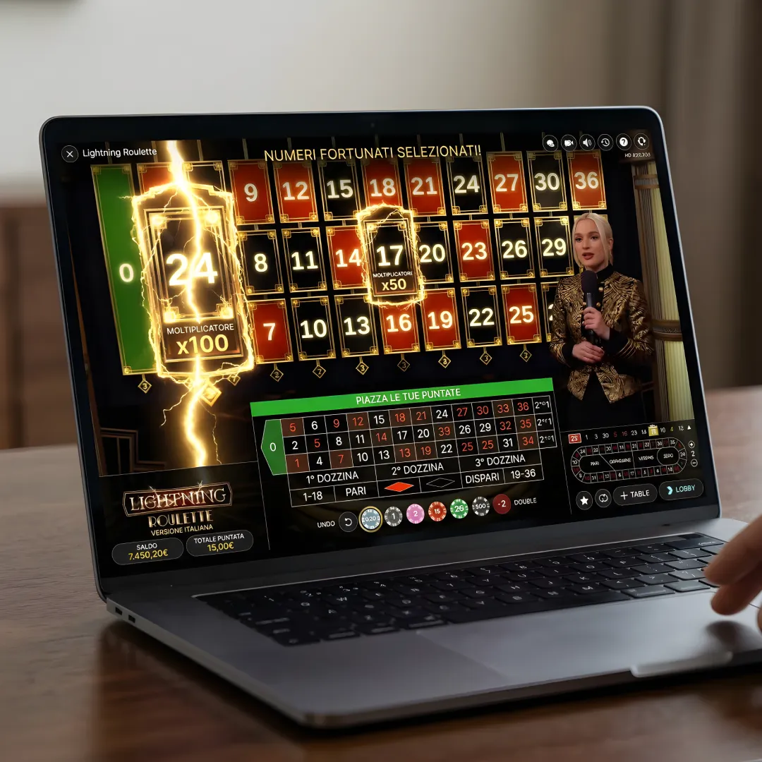 Lightning Roulette è un gioco live di Evolution che combina la roulette europea a 37 numeri con moltiplicatori lightning casuali fino a 500x. Un presentatore dal vivo guida ogni fase, dalla raccolta puntate all’estrazione dei Lucky Numbers.